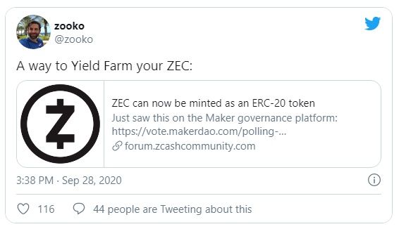 SponsoredA partir de septiembre, más de 900 ZEC están envueltos en Ethereum. Zooko Wilcox, CEO de Electric Coin Company, tuiteó recientemente sobre la agricultura de rendimiento ZEC.