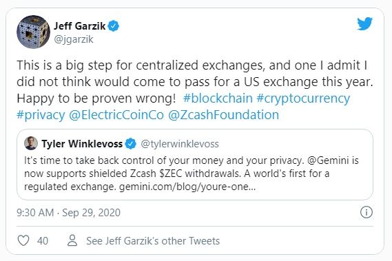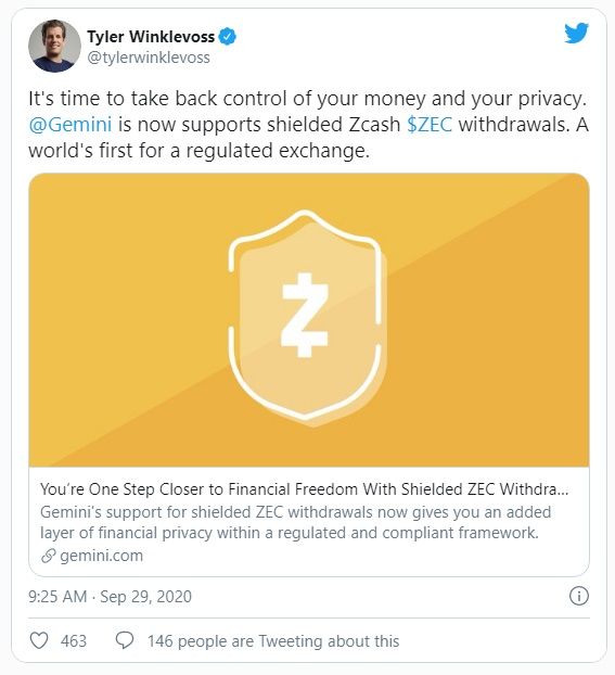 Tyler Winklevoss, el cofundador de Gemini, anunció en Twitter que el exchange de criptomonedas ahora admite retiros protegidos de Zcash.
