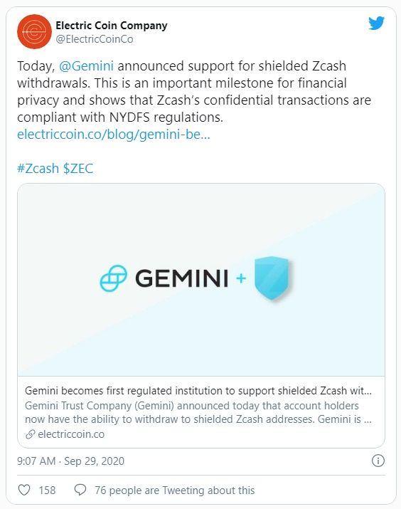 The Electric Coin Company, que está detrás de la moneda de privacidad Zcash, también promocionó el desarrollo, diciendo que es un sello de aprobación regulatoria para las transacciones confidenciales de Zcash.