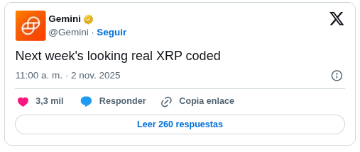 Al momento de esta reporte, Gemini no publicó nuevas declaraciones. Sin embargo, la naturaleza del post eleva la expectativa sobre un posible anuncio esta semana. Por ahora, el sector solo especula sobre el futuro de XRP, a la espera de que el interés se traduzca en acción concreta o, al menos, en una aclaración definitiva.