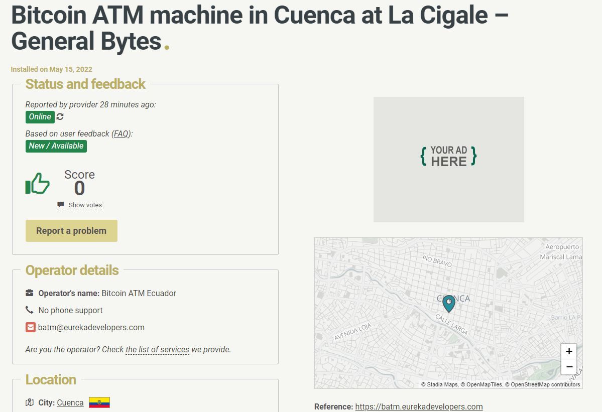 De acuerdo con Coin ATM Radar, el cajero de General Bytes en la ciudad de Cuenca, Ecuador, es el primero en el país, y otros cajeros del mismo proveedor en América Latina se ubican en Bogotá y Pereira, en Colombia, además de que la dirección exacta de su ubicación es Honorato Vásquez 7-80 y Luis Cordero.