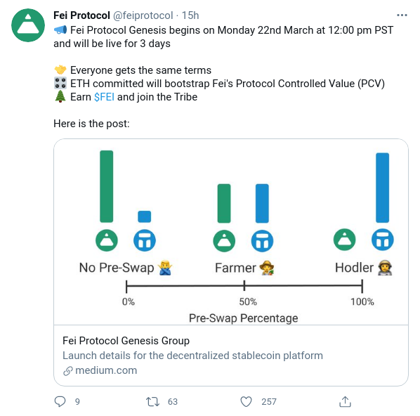 El equipo ha tomado medidas para evitar la actividad de bots y la inversión ventajista o frontrunning en el pool de liquidez FEI/TRIBE. Después de la génesis, los incentivos agrícolas de rendimiento impulsarán la nueva economía y promoverán el uso de la stablecoin FEI.
