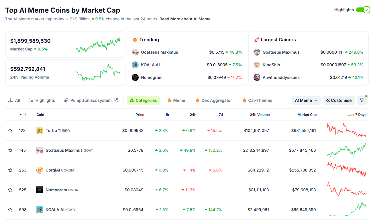 Según datos de CoinGecko, la capitalización de mercado de las memecoins basadas en IA se disparó a casi 1,9 mil millones de dólares, aumentando un 9.5% el 23 de octubre. Además, el volumen diario de trading superó los 590 millones de dólares.