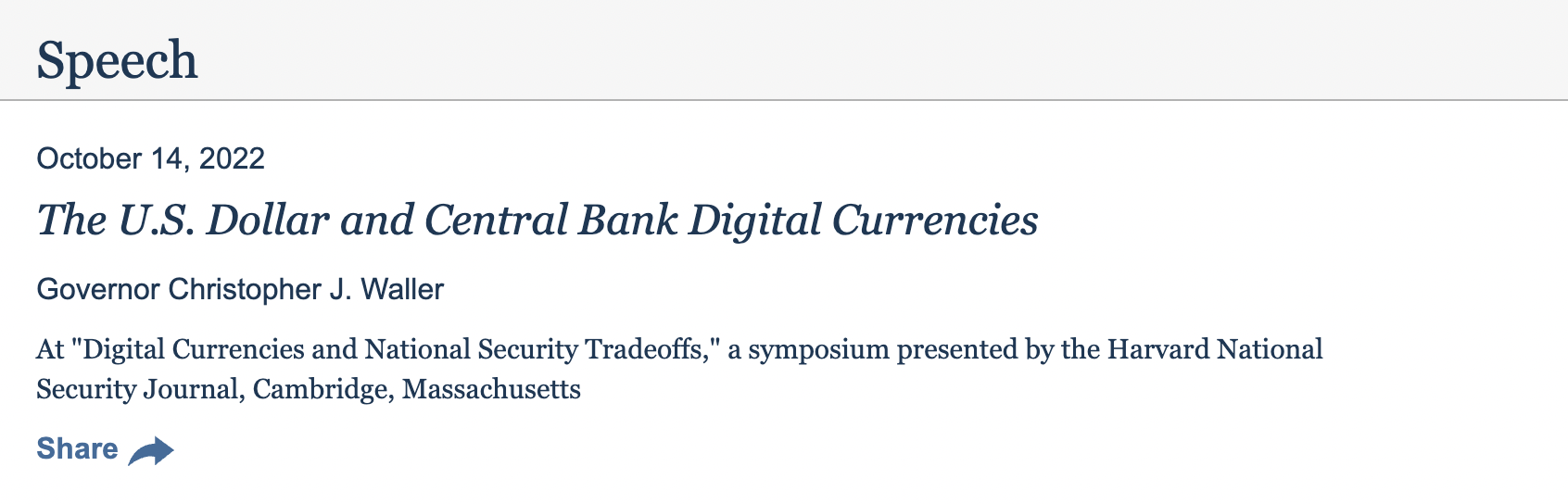 Waller argumenta que cualquier amenaza planteada por una CBDC extranjera solo amenazaría el dominio del dólar como medio de intercambio, no como depósito de valor o unidad de cuenta.