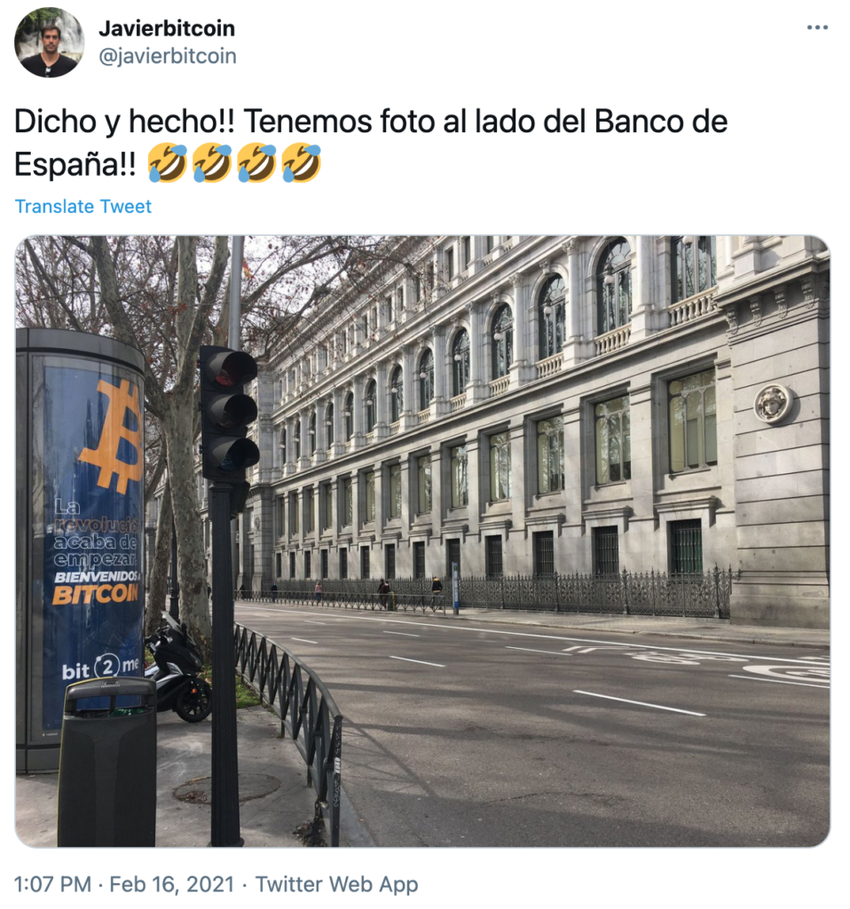 De igual modo, el pasado 16 de febrero, la campaña Bitcoin se lanzó en Madrid, viendo 800 carteles distribuidos por la capital española. Entre los cientos que hubo distribuidos, el que más revuelvo obtuvo fue el cartel posicionando delante del Banco de España, donde se leía “La revolución acaba de empezar. Bienvenidos a Bitcoin”.