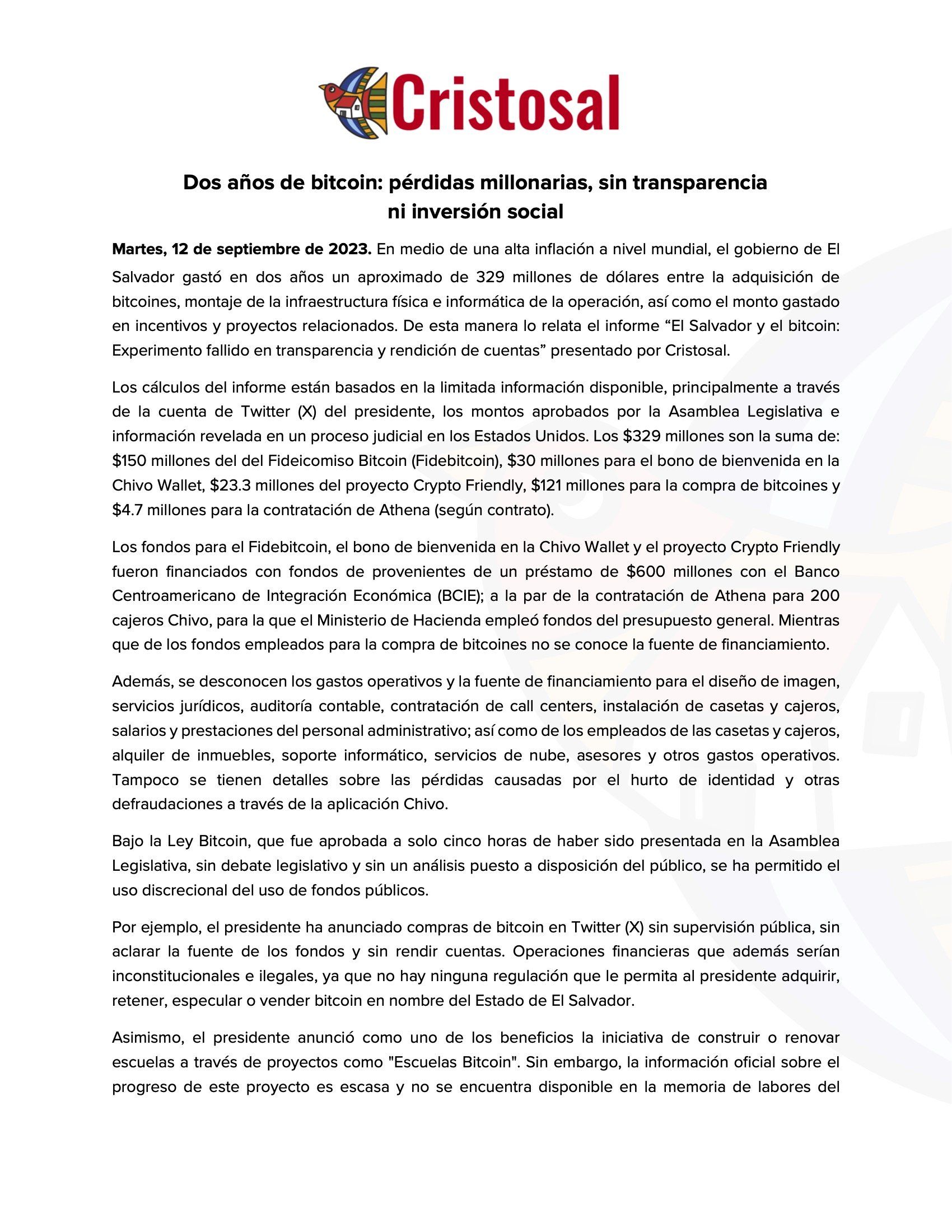 Cristosal argumenta que los recursos invertidos en la implementación del Bitcoin podrían haberse destinado a áreas de mayor prioridad para la población, como la educación, la lucha contra la pobreza y la atención médica.