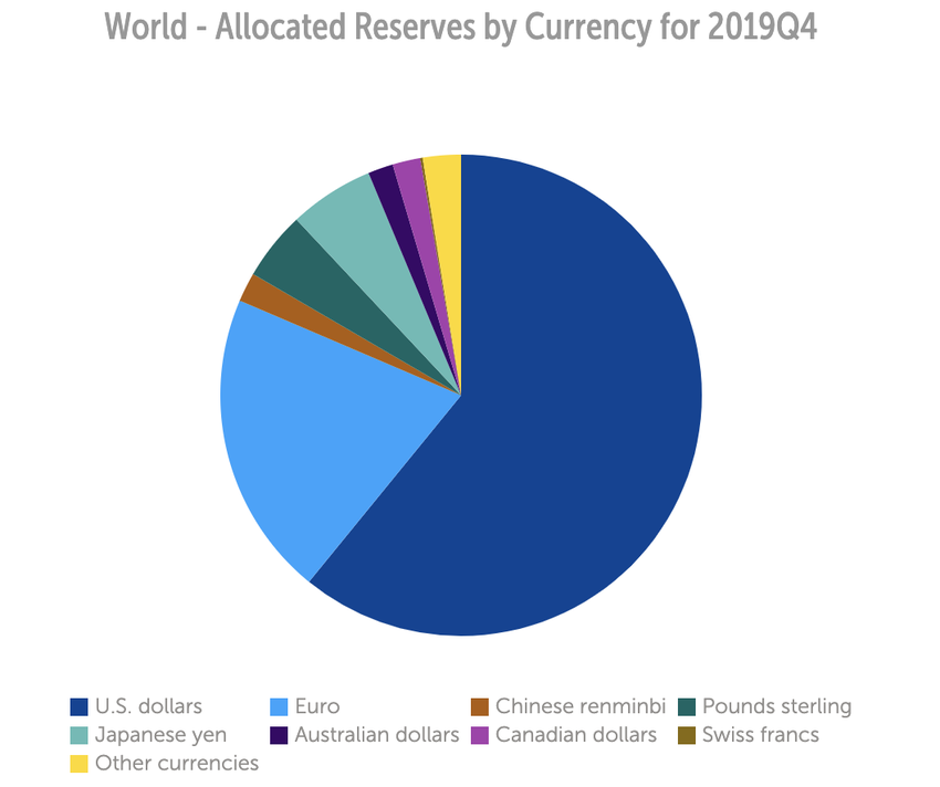 Según el FMI, el dominio del dólar en las reservas asignadas para el cuarto trimestre de 2019 fue de aproximadamente el 61%. Esto es relativamente igual a lo que fue en 2010, según los datos. Ni siquiera la Gran Recesión fue suficiente para romper el dominio del dólar.