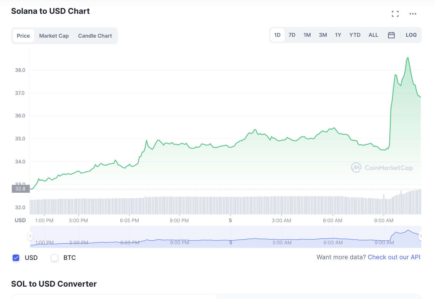 El anuncio de Google Cloud disparó el precio de SOL, al pasar de 34,51 dólares a 38,55 dólares en un lapso de dos horas, mientras que el volumen de transacciones aumentó 75,74% y la capitalización de mercado de Solana se incrementó 12,09%, a 18,839 mil millones de dólares, de acuerdo con CoinMarketCap.