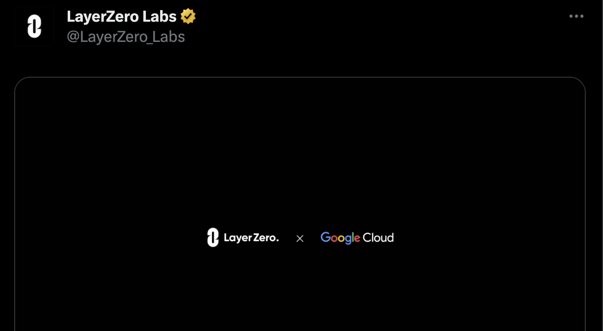 El martes, el equipo de LayerZero anunció su asociación con Google Cloud. Esta asociación permitirá a los usuarios de LayerZero aprovechar la infraestructura de Google Cloud de forma predeterminada para cada mensaje. LayerZero Labs escribió en X (Twitter):