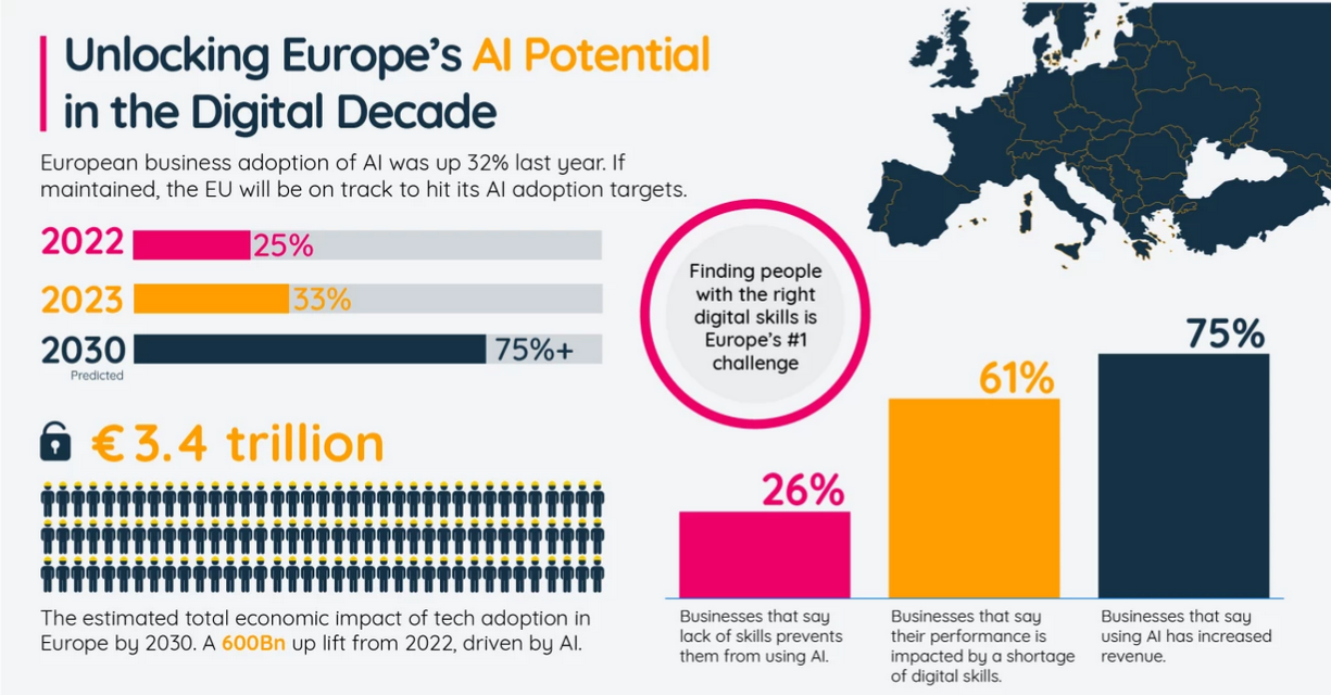 La Comisión Europea tiene como objetivo que el 80 por ciento de la población de la UE tenga habilidades digitales básicas para 2030. Sin embargo, según Eurostat, alrededor del 56 por ciento de la población de entre 16 y 74 años tiene “habilidades digitales básicas en general”, con grandes diferencias entre los estados miembros de la UE.