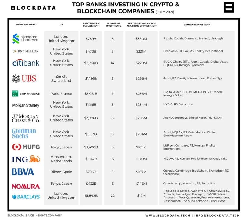 De acuerdo a un informe reciente publicado por Blockdata, el 55% de los principales bancos por activos bajo gestión han invertido en empresas relacionadas con criptomonedas o blockchain.