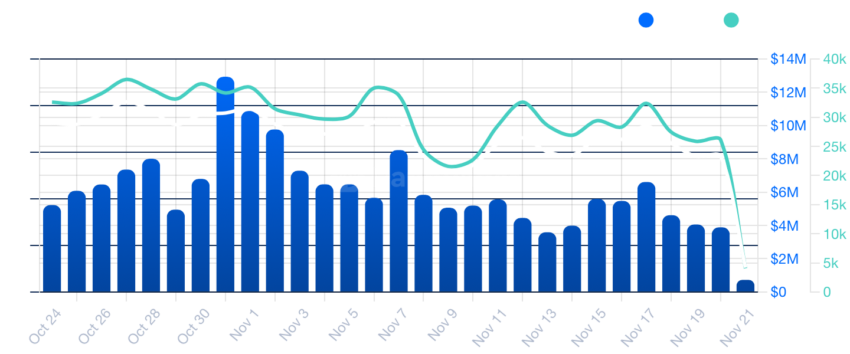 En este período entre el 24 de octubre y el 21 de noviembre, el volumen de trading mensual registró un rango máximo de alrededor de 13 millones de dólares y ahora ha retrocedido a 4 millones de dólares.