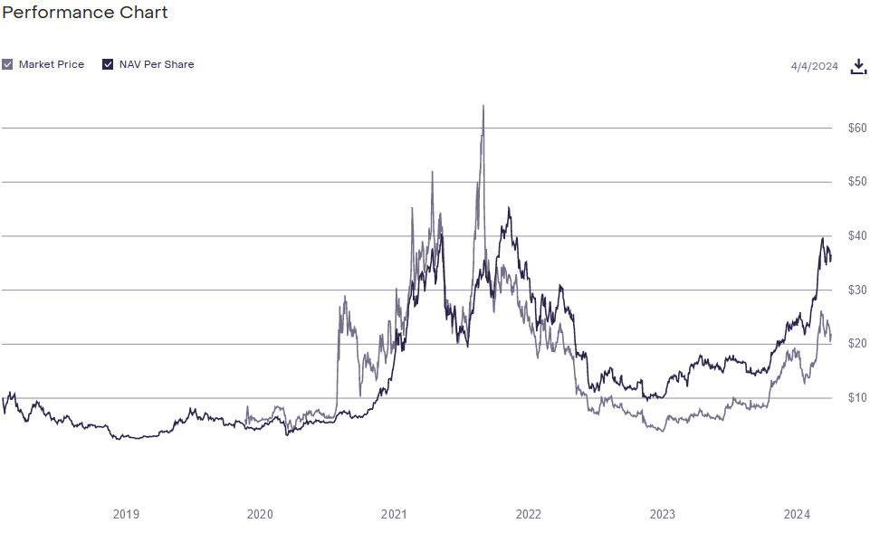 Luego de su máximo en el 2022, el rendimiento por acción del Digital Large Fund se decayó durante 2 años, recuperando apenas los valores promedio de 2021-2022 solo recientemente por el mercado alcista. En cuanto al precio de mercado, el desempeño es aún peor. Mostrando valores de 2024 representando apenas un 35% de su máximo histórico.