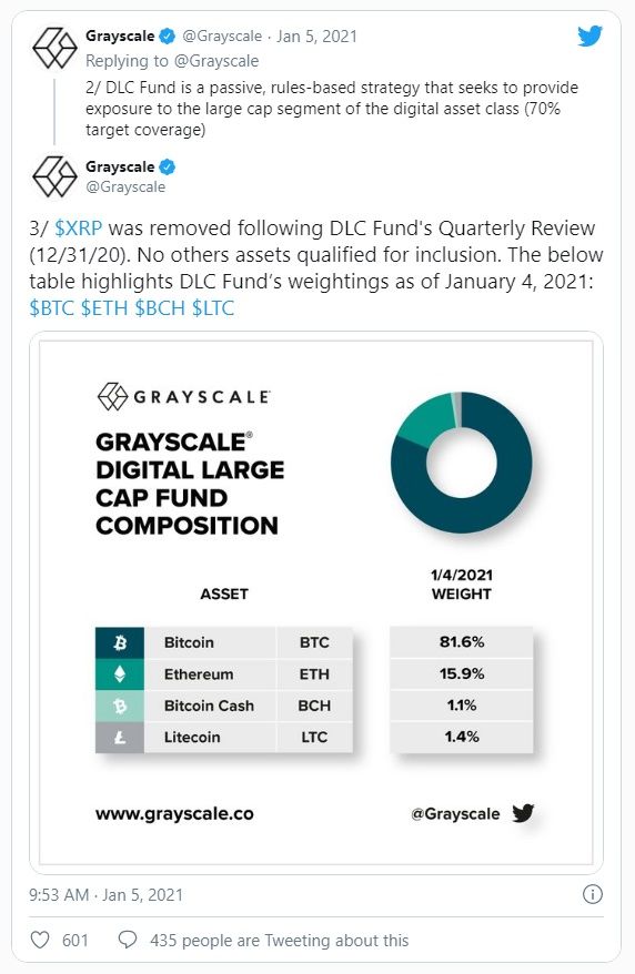 Grayscale, una empresa de gestión de activos digitales con más de 10 mil millones de dólares en criptomonedas bajo gestión, ha eliminado XRP de su Digital Large Cap (fondo digital de gran capitalización, DLC).