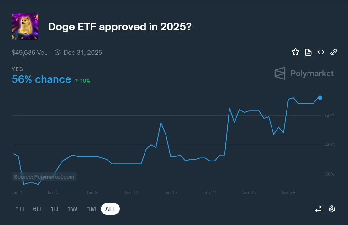 Los mercados de predicción han reaccionado fuertemente a estos desarrollos. Las probabilidades de Polymarket para la aprobación del ETF saltaron al 56%. Esto refleja una creciente confianza en la aceptación regulatoria de productos de inversión cripto.
