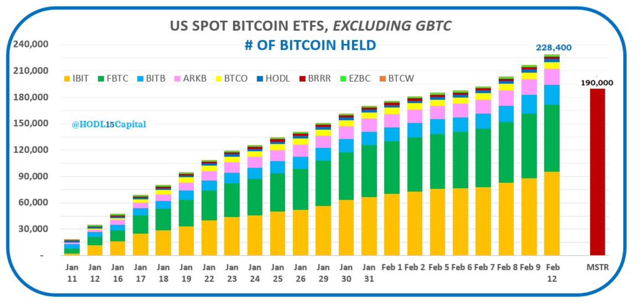 No obstante, BlackRock y Fidelity siguen comprando mucho más de lo que Grayscale vende. El 13 de febrero, se produjo una enorme entrada neta de 631 millones de dólares a pesar de las salidas de GBTC.