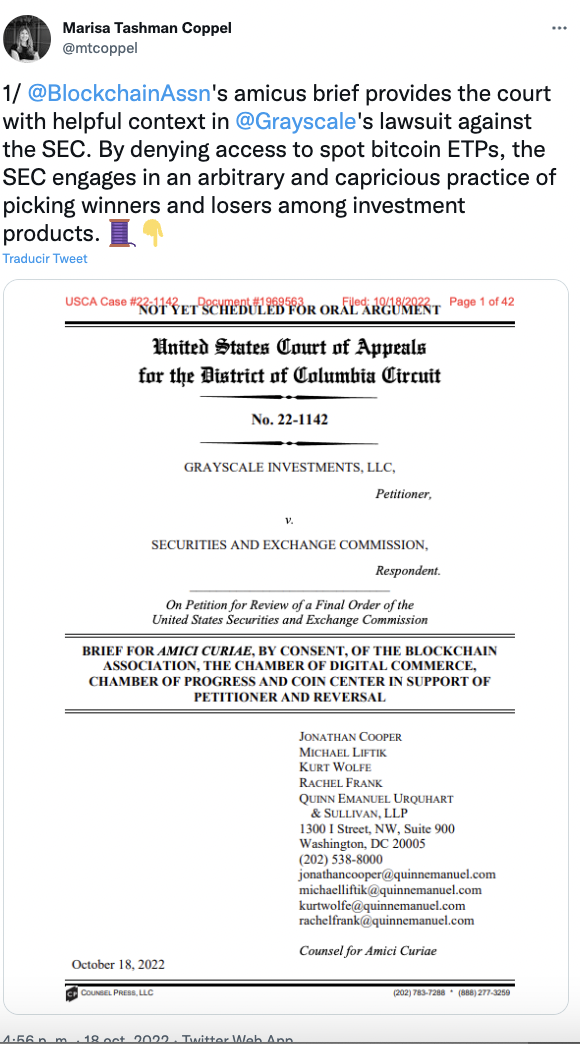 La Blockchain Association ha proporcionado un informe a los tribunales que describe los argumentos principales a favor de un producto cotizado en bolsa (ETP) de Bitcoin al contado de Grayscale.