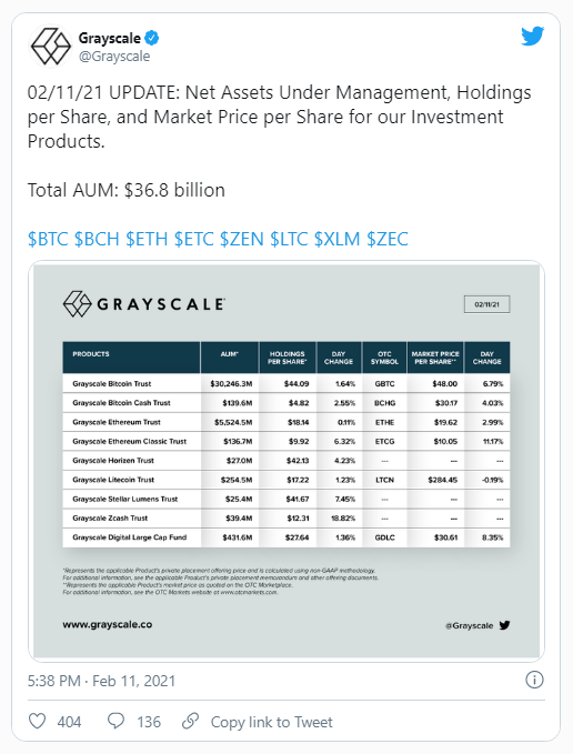 A finales de 2020, Grayscale también registró Trusts para Chainlink (LINK), el basic attention token (BAT), Descentraland (MANA), Tezos (XTZ), Filecoin (FIL) y livepeer (LPT).