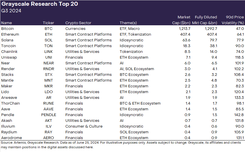 En su Top 20 para el tercer trimestre, Grayscale mencionó a Bitcoin, Ethereum, Solana, Toncoin, Chainlink, Uniswap, Near, Render. Asimismo, Stacks, Mantle, Maker, Lido, Arweave, ThorChain, Aave, Pendle, Akash, illuvium, Raydium, y Aerodrome. Las capitalizaciones de mercado oscilan entre 400 millones (AERO) y 1,2 billones de dólares (BTC).
