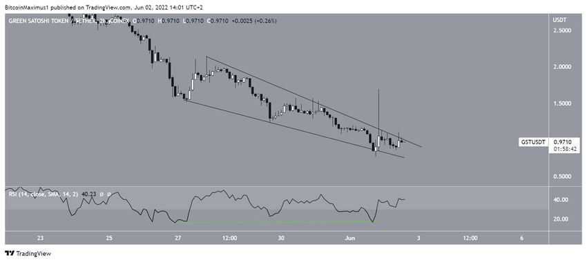 Finalmente, el gráfico de dos horas muestra que GST ha estado operando dentro de una cuña descendente desde el 27 de mayo. La cuña descendente se considera un patrón alcista, lo que significa que se esperaría una eventual ruptura.