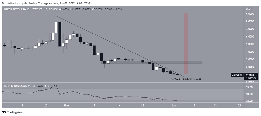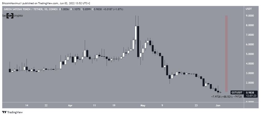 GST es el token en el juego de STEPN, el primer juego NFT Move-to-Earn en el que los jugadores ganan tokens caminando o corriendo. El token se lanzó en diciembre de 2021 y alcanzó un máximo histórico de 7.82 dólares el 29 de abril de 2022. Pero ha estado cayendo desde entonces y alcanzó un precio mínimo histórico de 0.70 dólares el 1 de junio.