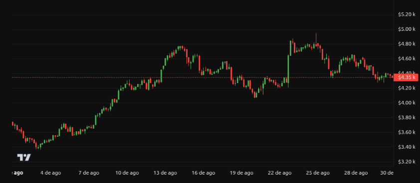 Ethereum cotiza en 4,342 dólares con un volumen de 32 mil millones de dólares en 24 horas. Superó su ATH anterior de 4,878 dólares en agosto, consolidando un canal ascendente con soporte en 4,300 dólares y resistencia en 4,900 dólares. La SMA 50 se ubica en 4,000 dólares y la SMA 200 en 3,500 dólares, confirmando fuerza alcista estructural.