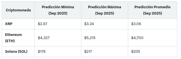 En este análisis se detalla el desempeño actual y proyecciones de XRP, Ethereum y Solana, tres de los activos que concentran atención de traders e inversores. Con datos técnicos, factores fundamentales y escenarios de riesgo, presentamos qué esperar del mercado en septiembre.