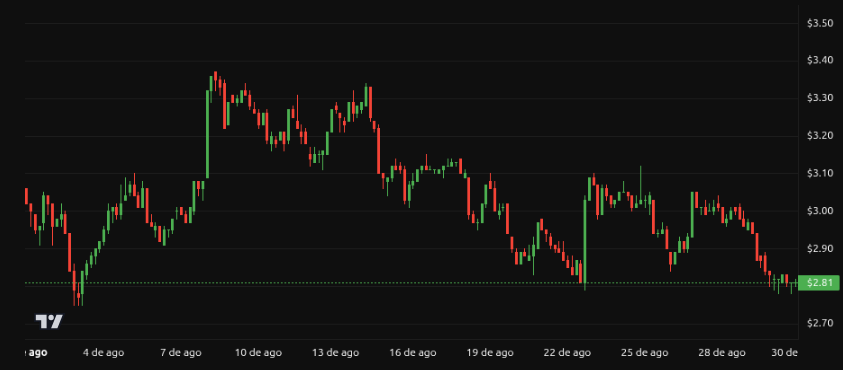 La IA de Elon Musk proyecta un rango entre 2.87 dólares y 3.24 dólares para septiembre, con posibilidad de alcanzar 3.50 si se confirman aprobaciones de ETF. Riesgo bajista: caída a 2.43 dólares si pierde 2.60 dólares.