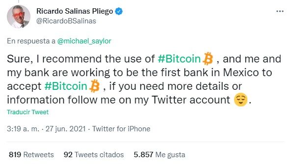 El mensaje de Salinas Pliego se produjo como respuesta a un tweet publicado por Alex Gladstein, con respecto a la adopción de Bitcoin en El Salvador: