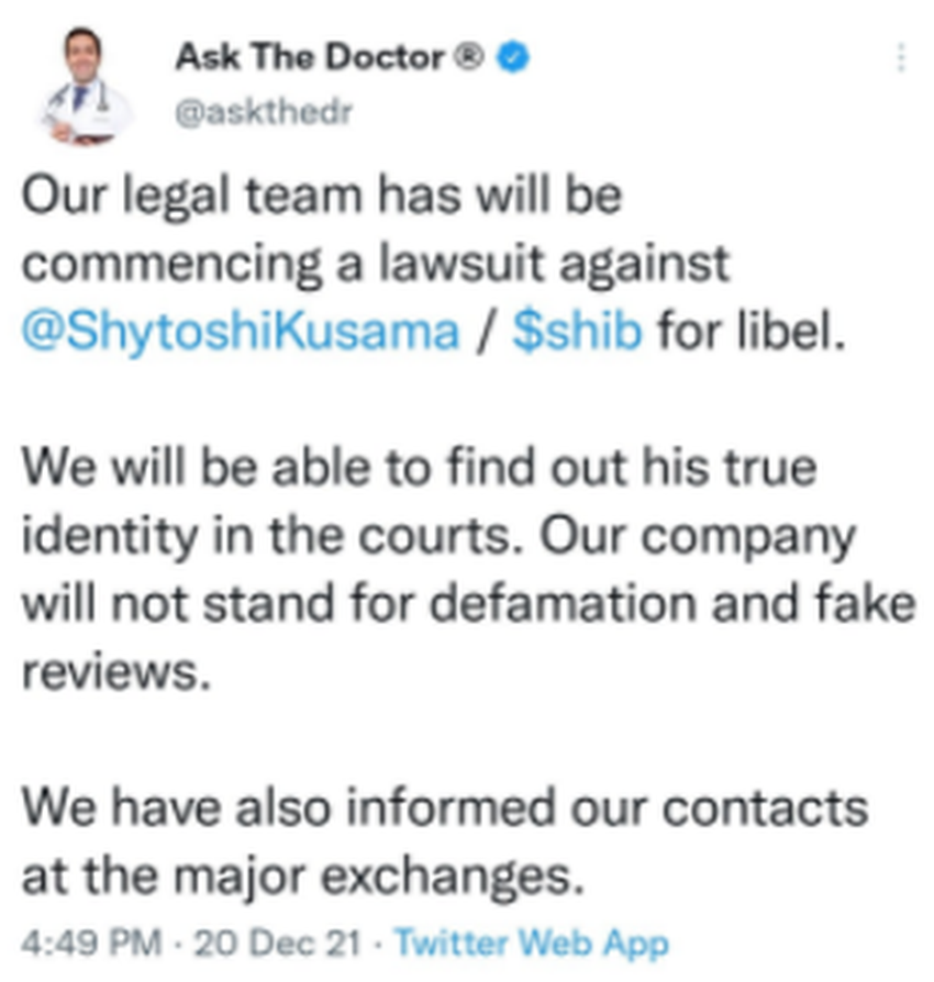 “Comenzaremos nuestra demanda inicial contra @Shibtoken y @ShytoshiKusama en el Reino Unido mañana”, dijo Ask The Doctor en uno de una serie de tweets que repetían afirmaciones similares: