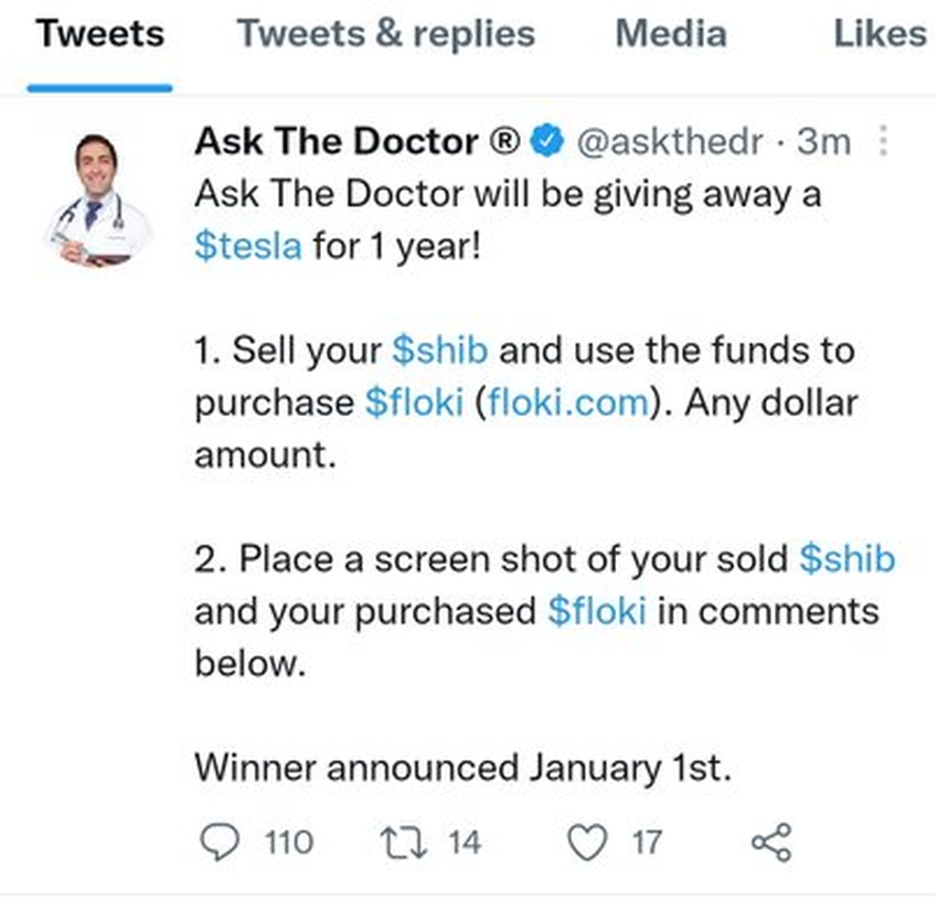 En el momento de la publicación, Ask The Doctor ya no tiene tweets que promocionen ninguna criptomoneda, ni tweets que promocionen obsequios temporales de Tesla por tiempo limitado.