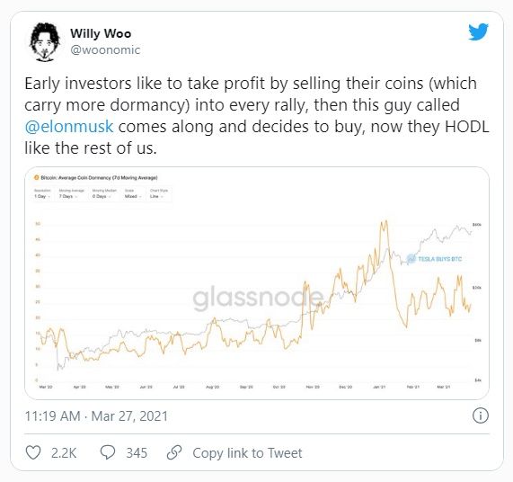 El analista en cadena de Bitcoin, Willy Woo, publicó un tweet el 28 de marzo que muestra un gráfico de Glassnode sobre la inactividad promedio de Bitcoin. El “Efecto Musk #1”, es decir, el efecto de sus tweets, no está presente.
