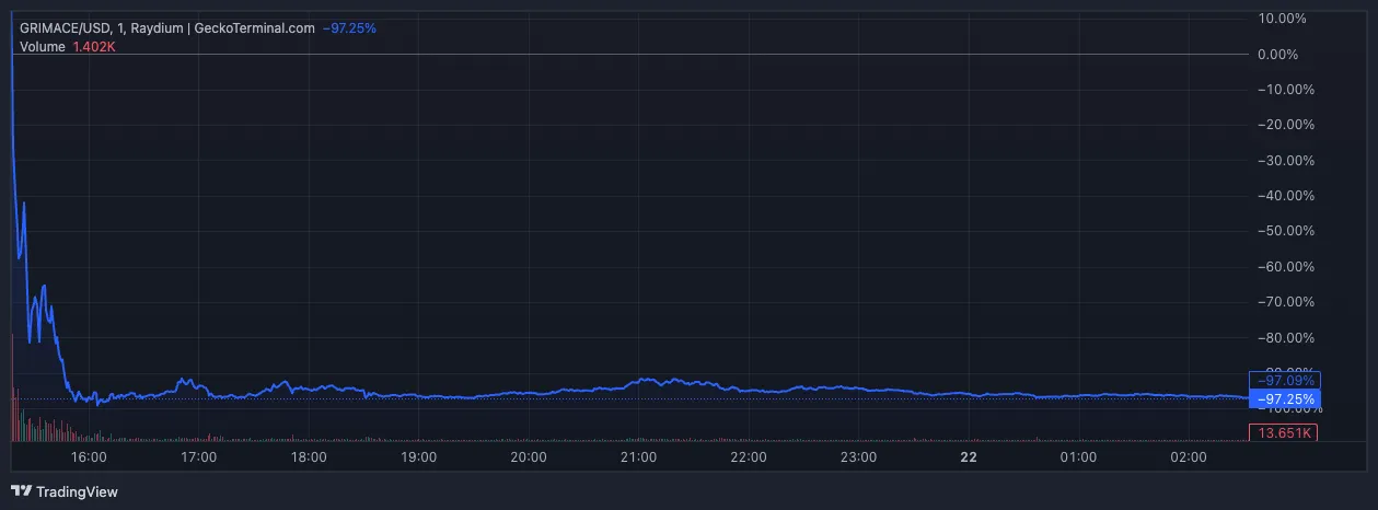 A pesar de muchas señales de alerta, los degens negociaron la memecoin GRIMACE para intentar una operación rápida. Por lo tanto, acumuló un volumen de trading de más de 25 millones de dólares en las últimas 24 horas.