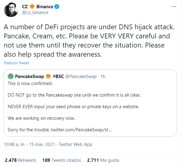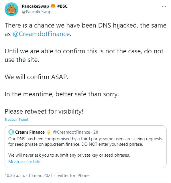“Varios proyectos de DeFi están bajo ataque de secuestro de DNS. Pancake, Cream, etc. Por favor sea MUY MUY cuidadoso y no los use hasta que recuperen la situación. Por favor, también ayude a difundir la o ocurrido”.