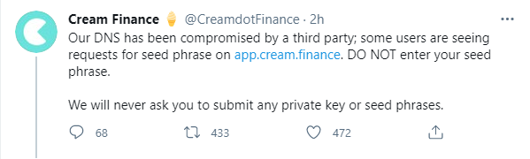 “Nuestro DNS ha sido comprometido por un tercero; algunos usuarios están viendo solicitudes de frase inicial en https://app.cream.finance. NO ingrese su frase semilla.