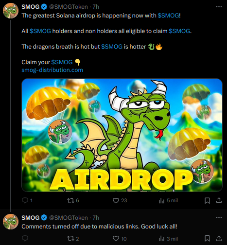 El hack de la cuenta de SMOG en X ocurrió hace aproximadamente 10 horas. Los atacantes han compartido diversas publicaciones para engañar a los usuarios que desean ser parte del airdrop del proyecto original.