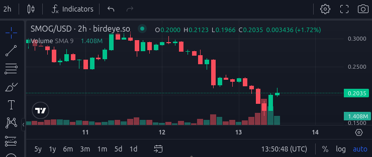 En medio del ataque, el precio de SMOG se desplomó aproximadamente 30%, alcanzando un mínimo de aproximadamente 0.1720 dólares. Sin embargo, se ha recuperado levemente y cotiza actualmente en 0.2035 dólares.