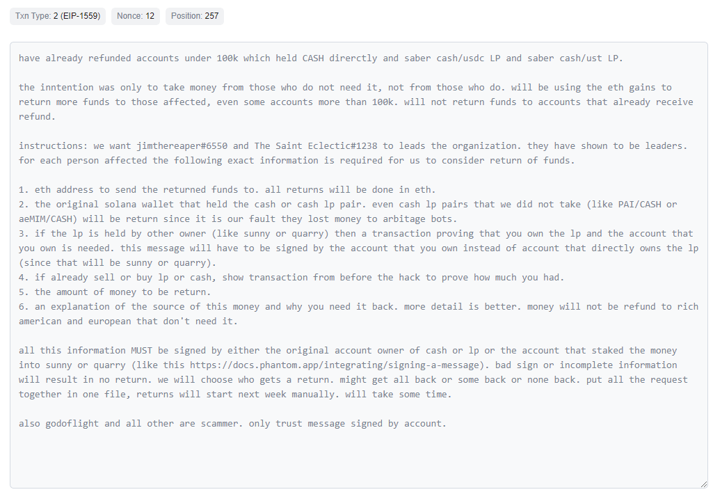 El hacker insertó este mensaje en una transacción de Ethereum la madrugada del lunes. Un proveedor de la comunidad de Cashio creó un sitio web para que las víctimas enviaran respuestas, utilizando una plantilla proporcionada por el hacker. Todas las víctimas que perdieron menos de 100 mil dólares han sido reembolsadas.