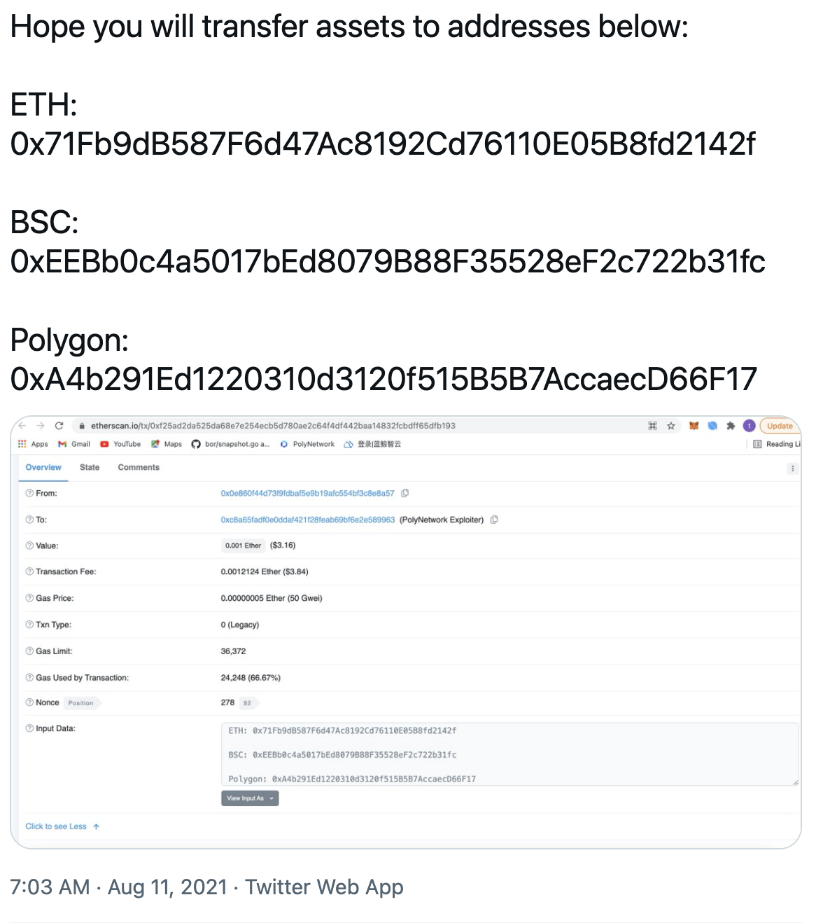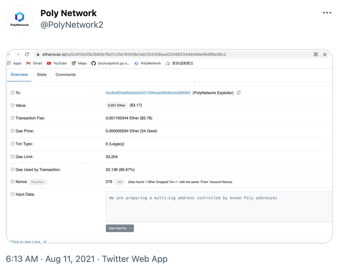 Posteriormente Poly Network publicaba las direcciones de Ethereum, Binance Smart Chain y de Polygon al cual el hacker debería mandar los fondos robados. Por ello, se podrá ver en directo y en abierto cómo el hacker retorna los fondos robados del hack más grande de la historia de DeFi.