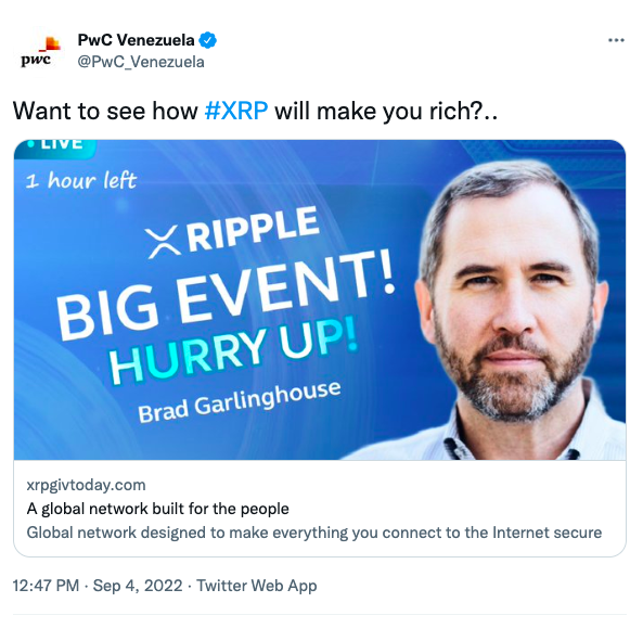 Un hacker irrumpió en la cuenta de Twitter de la firma de contabilidad PwC Venezuela y publicó estafas de XRP.
