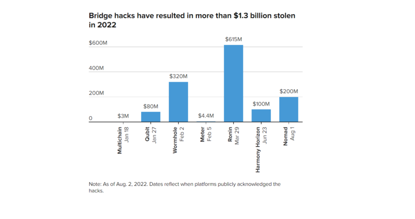 El crecimiento de los hacks a bridges ha generado mucho dolor de cabeza a la industria por la velocidad con la que ha aumentado. Se registraron 52 hacks en el primer trimestre de 2022 y 96 hacks en el segundo trimestre del mismo año, un aumento del 85%. En la primera mitad de 2021, solo se registraron 38 incidentes relacionados con la piratería.