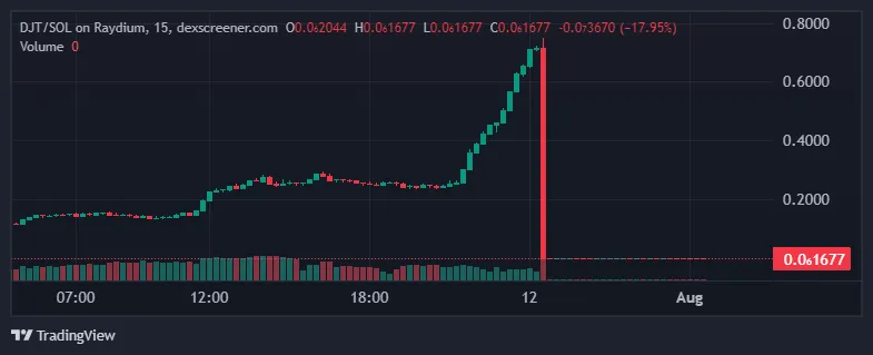 A pesar de esto, DJT atrajo cientos de millones de dólares antes de que los fundadores ejecutaran un rug pull a principios de agosto, causando que su valor se desplomara.
