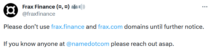 En Twitter, el equipo de Frax Finance pidió a los usuarios que no visitaran frax.finance y frax.com. Recurrieron al registrador de nombres de dominio Name.com en busca de ayuda.