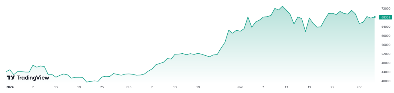 La tendencia actual del precio de BTC es al alza, con un crecimiento de 61% desde el inicio del año, según datos de TradingView. Este crecimiento podría ser atribuido a la expectativa del halving, la creciente adopción por parte de instituciones y la aprobación de los ETF spot de Bitcoin en Estados Unidos.