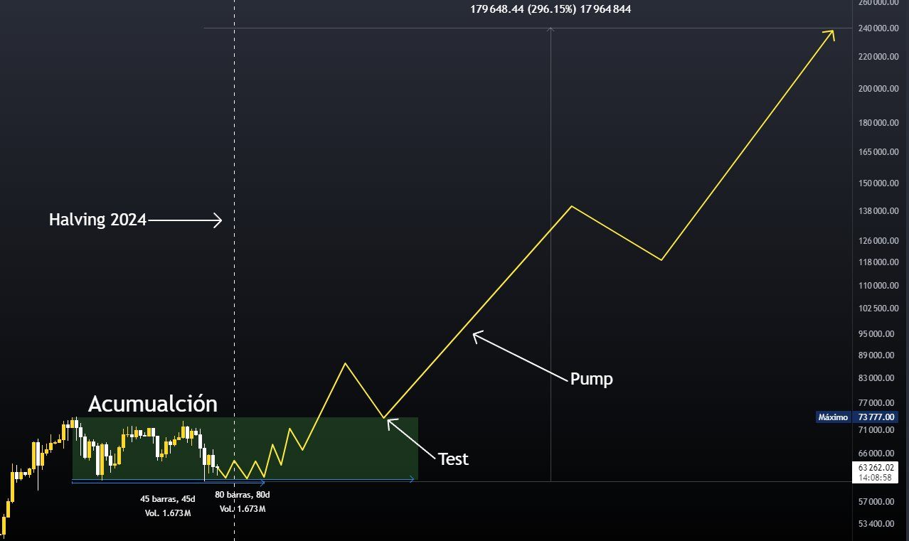 “Lo probable son 45 y 50 días [de corrección], empezaría a bombear para final de Abril principio de Mayo. Luego Bull Market Parabólico +300% (240K por BTC), señala Arnau4Bet”.