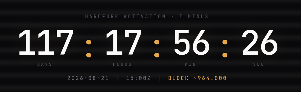 La cuenta regresiva en el sitio oficial apunta al bloque 964,000, estimado para el mes de agosto. El nodo será descrito por su creador como un “clon casi exacto” del cliente Bitcoin Core y mantendrá el algoritmo SHA-256, aunque la dificultad de minería se reiniciará al valor mínimo.