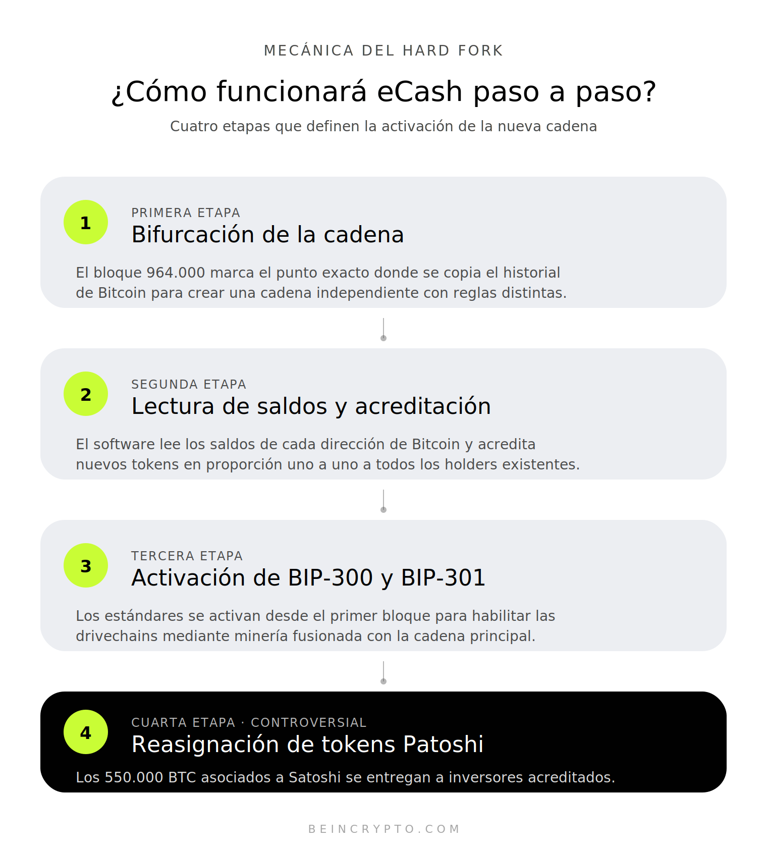 Un hard fork es una bifurcación que copia el historial de Bitcoin en un punto exacto y crea una cadena independiente. Al activarse, el software de eCash leerá los saldos de cada dirección y acreditará nuevos tokens en proporción 1:1.