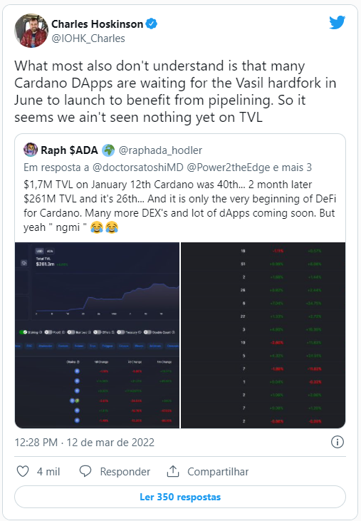 Hace un mes, Hoskinson dijo en Twitter que hay muchas aplicaciones DeFi en Cardano esperando el hard fork Vasil y que después de su implementación, el crecimiento en el TVL de Cardano “será aún más impresionante”.