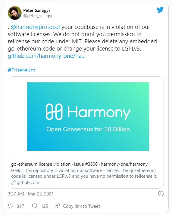 El 22 de marzo, el desarrollador de Ethereum Péter Szilágyi tuiteó que Harmony estaba violando una licencia de software de código abierto. Entró en más detalles en un problema de GitHub, indicando que la licencia de código abierto de Ethereum no otorgaba permiso a Harmony para volver a licenciar el código copiado bajo la licencia actual del MIT del proyecto.