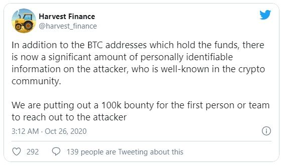 Tales ataques son comunes en el mundo de las criptomonedas, pero las secuelas del supuesto hack de Harvest son algo únicas. En un tweet poco después del incidente, Harvest Finance anunció que tenían datos suficientes para identificar al atacante, que es “muy conocido en la comunidad de cripto”.